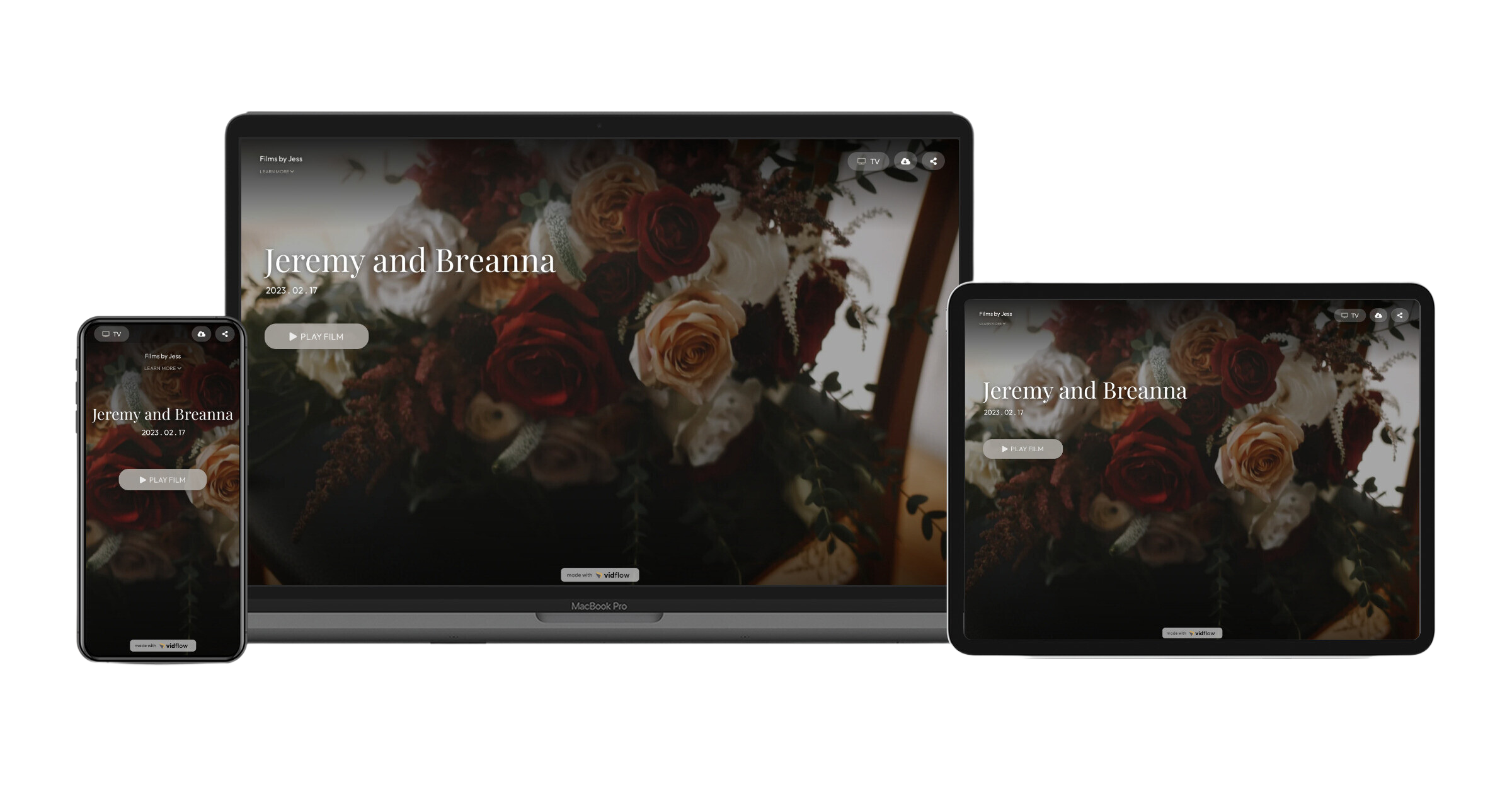 We're thrilled to offer you a personalized webpage where you can view, download, and effortlessly share your wedding film and video memories. With VidFlow, your special moments are beautifully showcased and easily accessible, ensuring your memories are always just a click away.